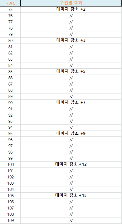 AC - 85 방어구 부터 대미지 감소 +2 추가 , AC - 5 추가 될 때마다 대미지 감소 +2 추가