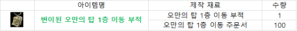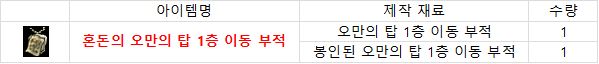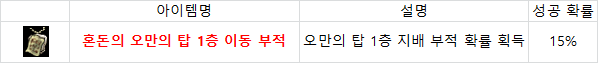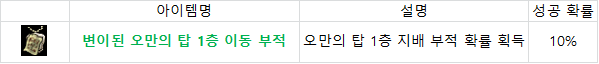 설명 : 개봉 시 오만의 탑 1층 이동 부적 혹은 오만의 탑 1층 지배 부적을 얻는다.
